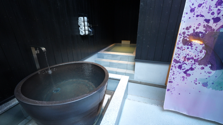 1枠4時間6人まで貸し切り可能なサウナ施設で、建物内のととのいスペースの天井部分は6m超えの吹き抜け空間、屋根や窓がなく、室内にいながら外気浴が楽しめます。サウナ室内は薪ストーブで、壁面は地元笠間焼の職人が焼き上げた400枚以上のタイルが貼られていて、輻射熱の効果もあり低温でも大量の発汗が可能です。水風呂は天然地下水かけ流しで贅沢な施設です。
