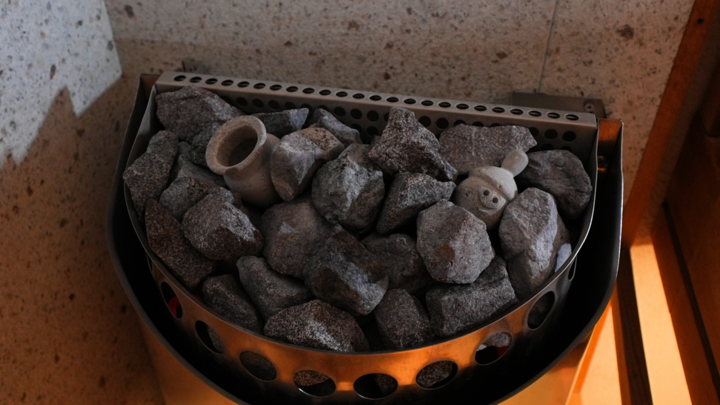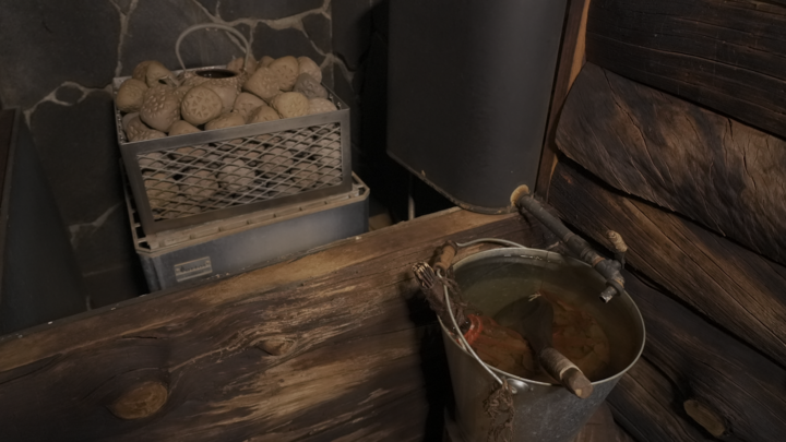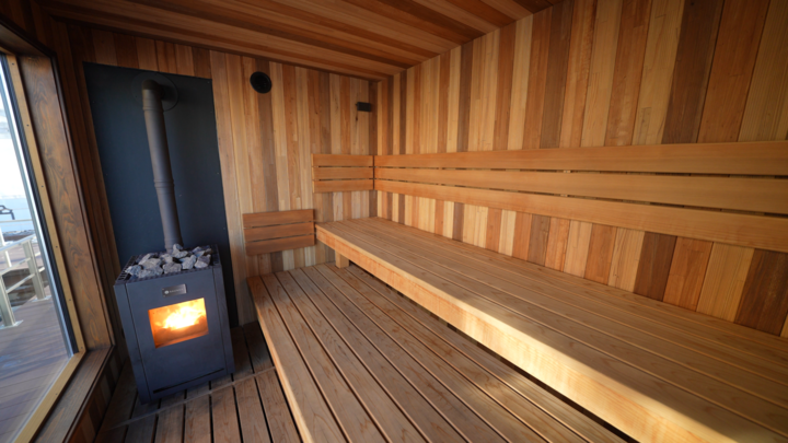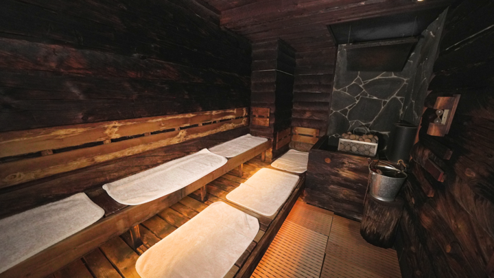 『手酌蒸気』はフィンランド産のケロ材を壁や座面全てに使用したセルフロウリュが可能なサウナ室。
