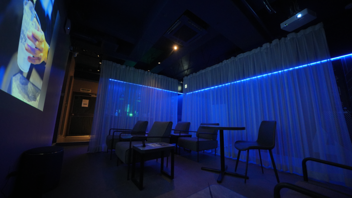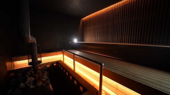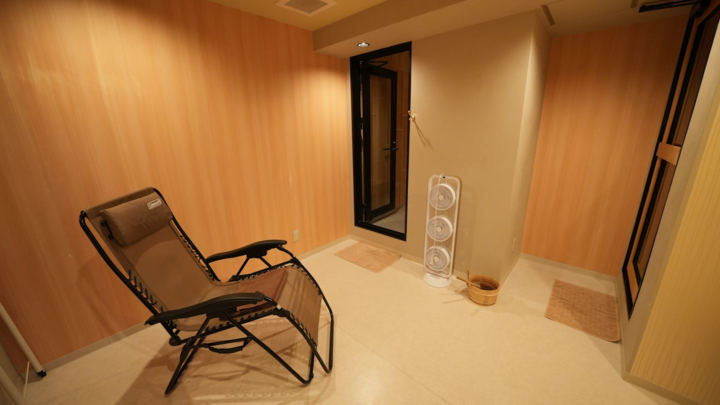 『瞑想』はほぼ真っ暗な室内で半個室型の座席に座り、専用ホースから水を出せば、座面の洗浄と自分の体にもかけられるので、長居したくなるようなサウナ室です。