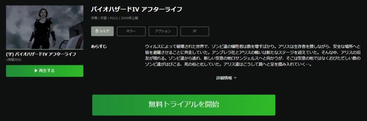 なので、見放題作品である映画『バイオハザードIV アフターライフ』の動画を0円でフル視聴可能です!