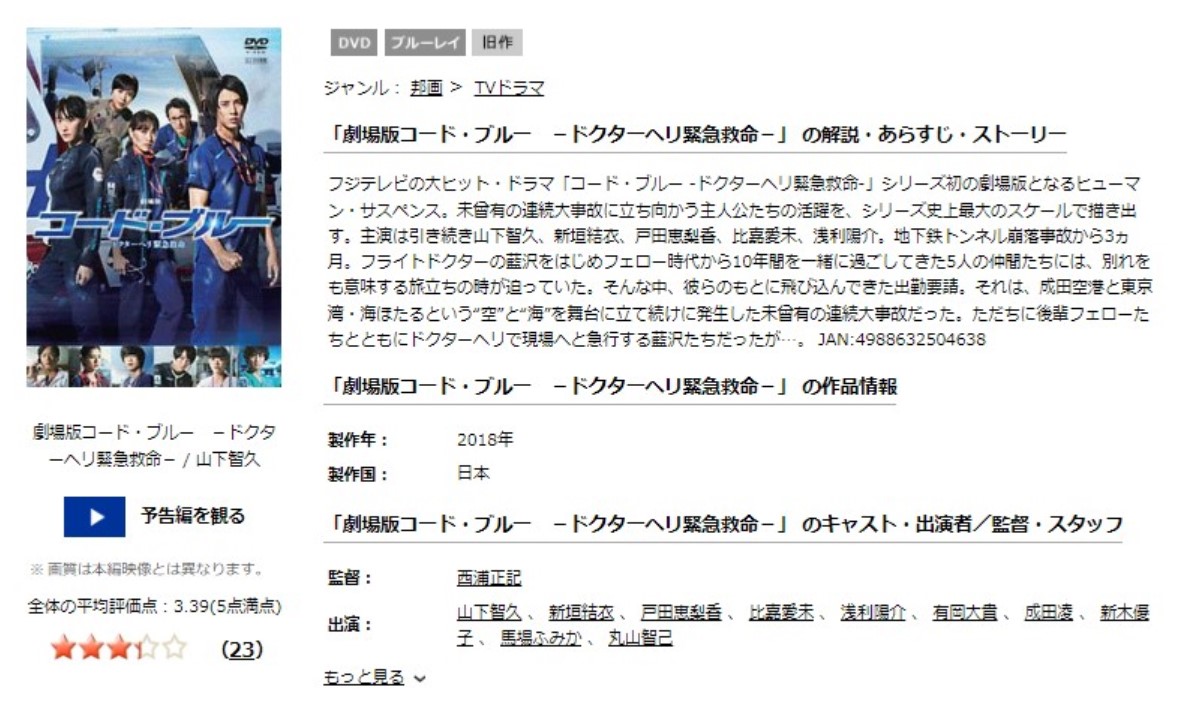 となっており、映画『劇場版 コード・ブルー ‐ドクターヘリ緊急救命‐』は「旧作DVD」扱いですので無料でレンタル可能です!