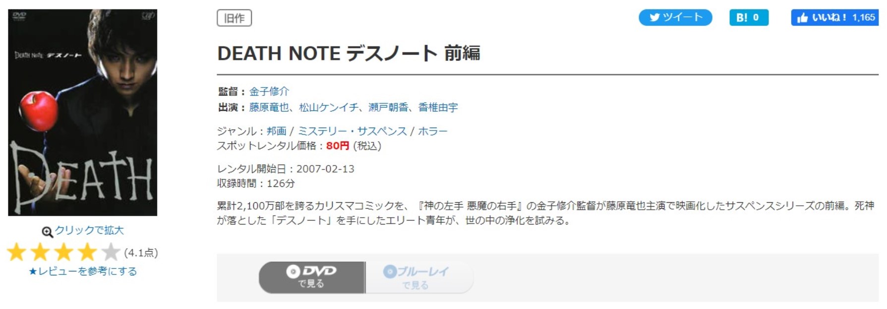 となっており、映画『DEATH NOTE デスノート(実写)』は「旧作DVD」扱いですので無料でレンタル可能です!