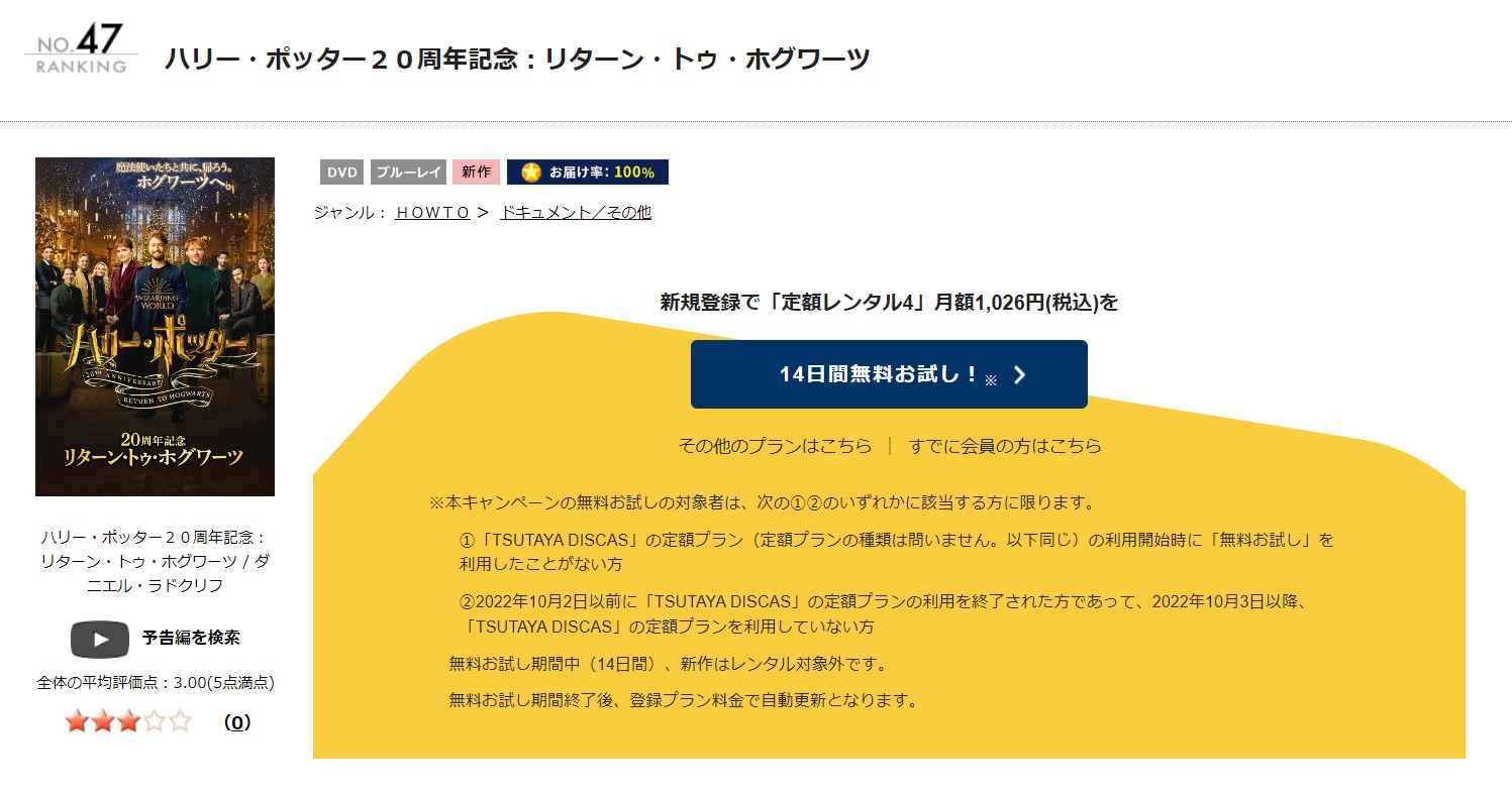 となっており、映画『ハリー・ポッター20周年記念(同窓会):リターン・トゥ・ホグワーツ』などの「新作DVD」は無料期間が終了し、有料プランに移行後レンタル可能になります。