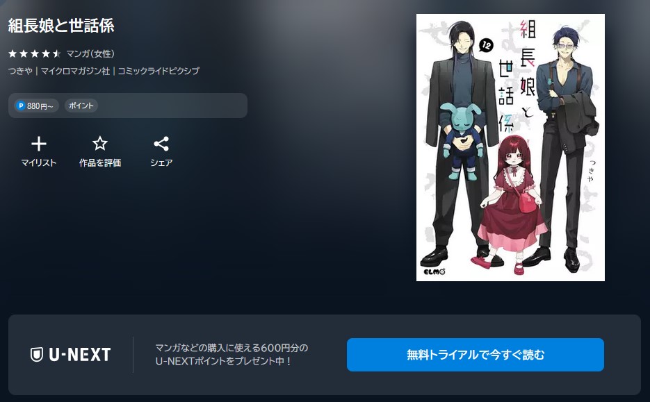 また、U-NEXTでは漫画『組長娘と世話係』も12巻まで1冊880pt〜で配信しています。