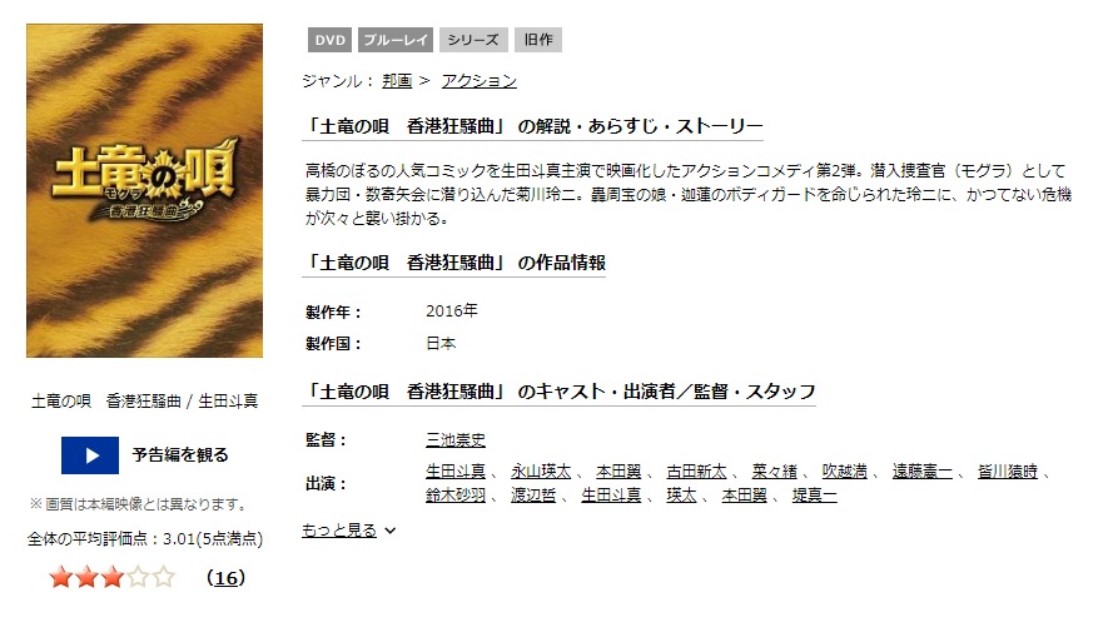 となっており、映画『土竜の唄2 香港狂騒曲』は「旧作DVD」扱いですので無料でレンタル可能です!