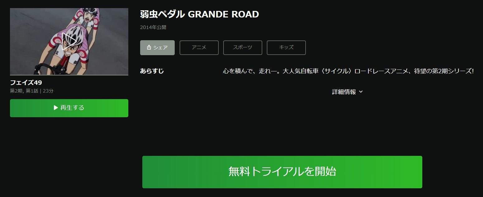U-NEXTには31日間無料トライアルがありますので、アニメ『弱虫ペダル GRANDE ROAD(2期)』の動画を全話視聴できます!