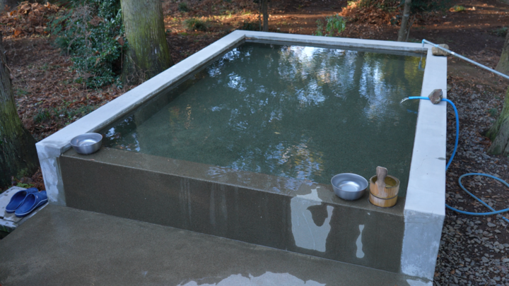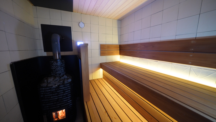 1枠4時間6人まで貸し切り可能なサウナ施設で、建物内のととのいスペースの天井部分は6m超えの吹き抜け空間、屋根や窓がなく、室内にいながら外気浴が楽しめます。サウナ室内は薪ストーブで、壁面は地元笠間焼の職人が焼き上げた400枚以上のタイルが貼られていて、輻射熱の効果もあり低温でも大量の発汗が可能です。水風呂は天然地下水かけ流しで贅沢な施設です。
