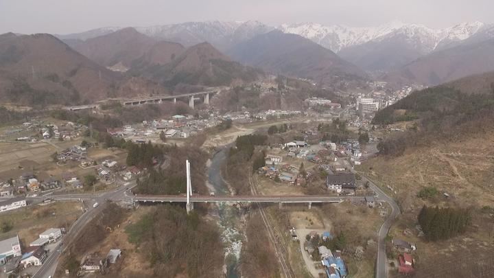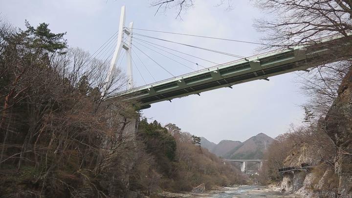 個性的な観光レクリエーション都市を目指すみなかみ町のシンボル橋梁『諏訪峡大橋』。橋上の歩道は、観光イベントが可能なように片寄せにし、4.5mと広い幅員を有しています。また、主塔や斜めに張ったケーブルは夜間ライトアップし、観光地・水上の玄関口を諏訪峡の渓谷美とともにアピールしています。